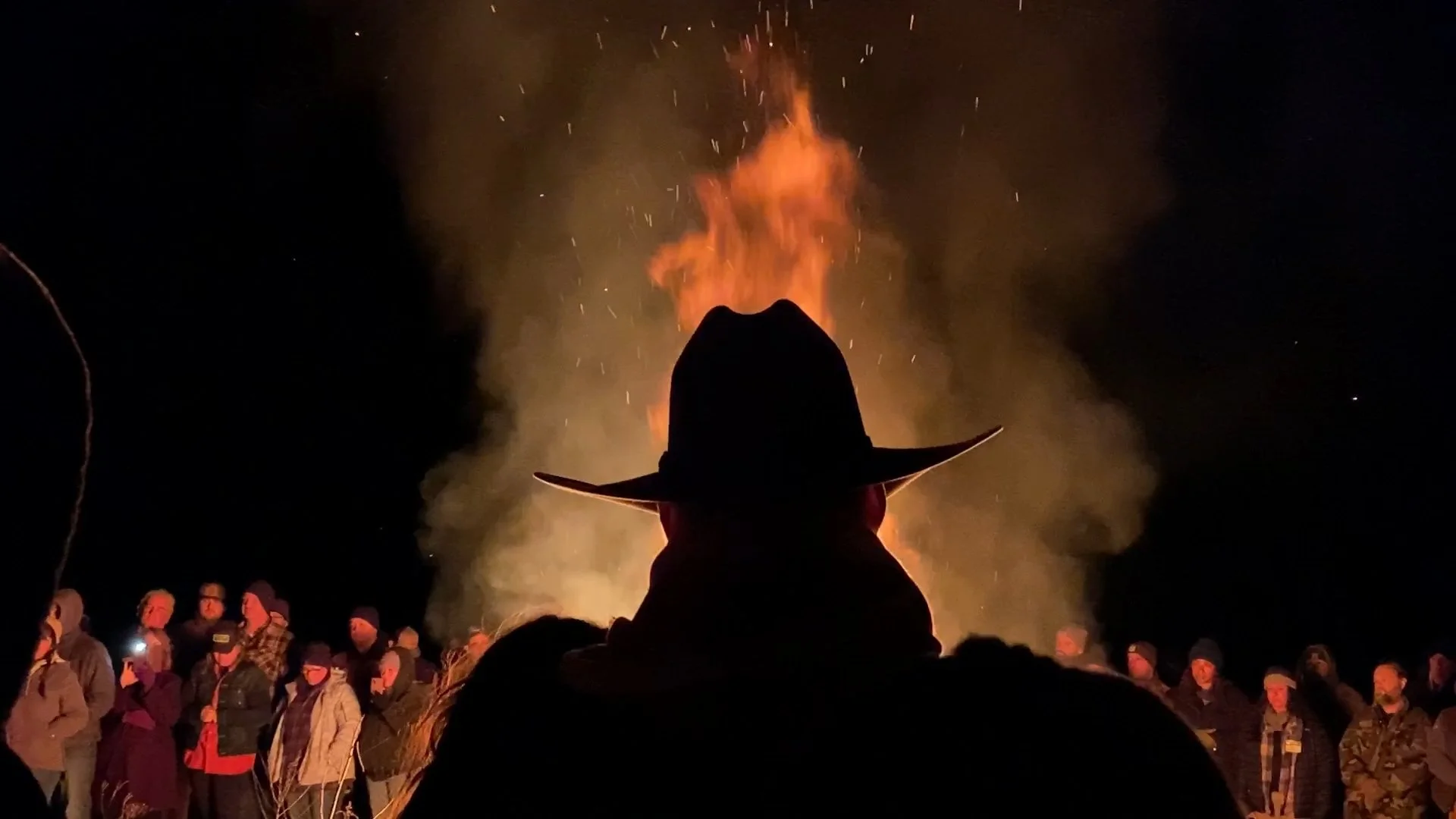 Slow motion shot of a Cowboy standing standing in front of a large roaring fire while flames and embers raise to the night sky.